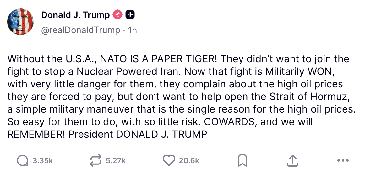 En un mensaje difundido en redes sociales, Trump afirmó que “sin Estados Unidos, la OTAN es un tigre de papel”, y reprochó que las naciones aliadas no quieran involucrarse en la apertura del estrecho de Ormuz, pese a que esa ruta es clave para el comercio mundial de energía y el encarecimiento del petróleo afecta directamente a Europa y otras economías.