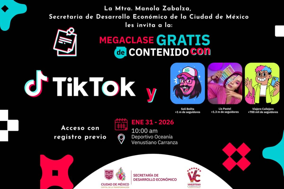 Es por ello que la SEDECO anunció la realización de la Mega Clase de Creadores de Contenido en TikTok, un evento gratuito que se llevará a cabo el próximo 31 de enero en el Deportivo Oceanía, en la alcaldía Venustiano Carranza.