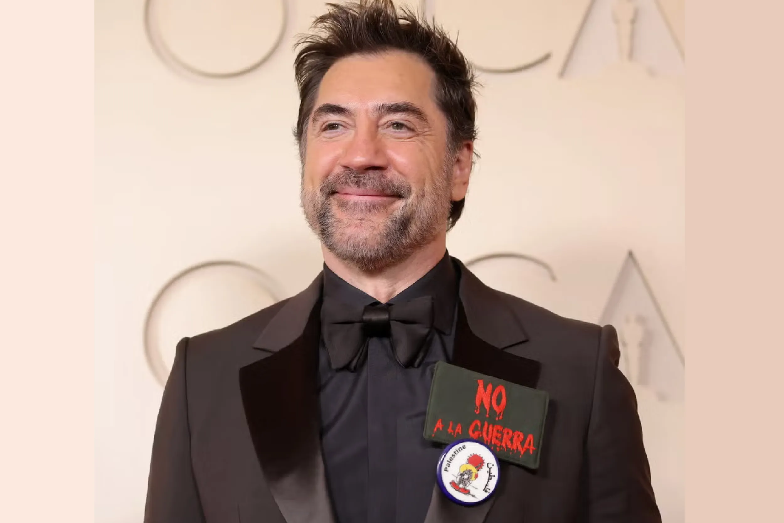Desde su llegada al evento, Bardem captó la atención al portar una chapa negra con la frase “No a la guerra” en rojo, diseñada como si fuera un chorro de sangre, en una clara postura política frente a los conflictos internacionales actuales.