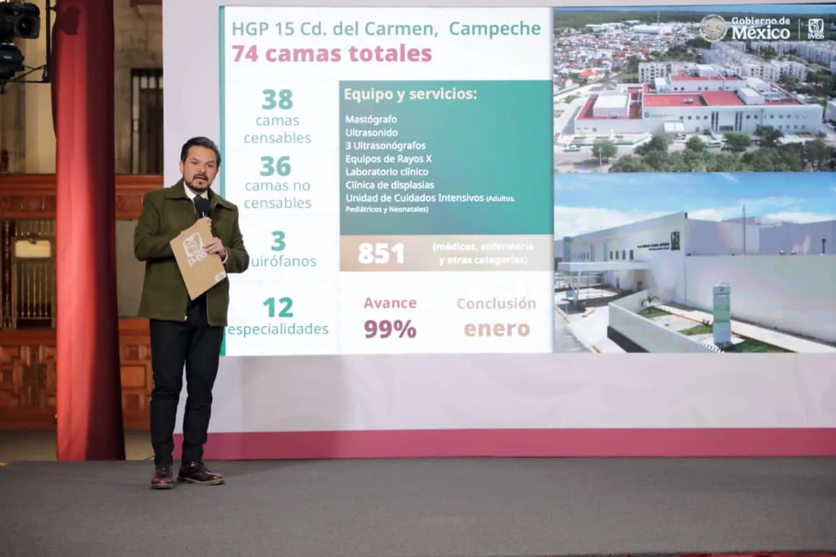 Entre las obras más avanzadas destaca el Hospital de Gineco Pediatría No. 15 en Ciudad del Carmen, Campeche, con 99% de avance, 74 camas y una plantilla proyectada de 851 trabajadores.